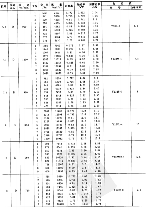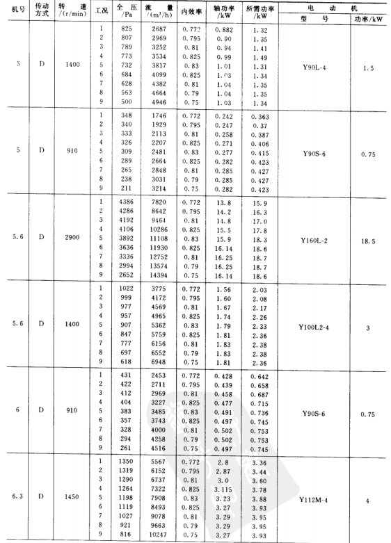 1)本風(fēng)機(jī)為單吸入風(fēng)機(jī),機(jī)號有No.3.15、3.55、4、4.5、5、5.6、6.3、7.1、8、9、10、11.2、12.5、14等共14個(gè)機(jī)號組成。